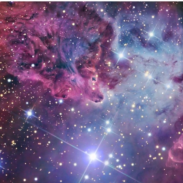 새로 형성된 별들과 가스구름이 함께 만든 이 성운은 직경이 130광년 정도 됩니다. 이온화된 수소가 스프레이로 뿌린 듯한 붉은색 깃털 구름 모양의 대부분을 구성하여 장미 성운의 독특한 색과 모양을 만듭니다.