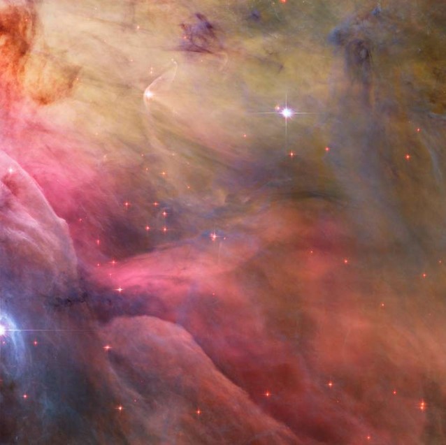 오리온 성운은 지구에 가장 가까운 별 형성 영역으로서, 오리온좌의 세 별 근처 매우 어두운 부분에서 희미하게 보입니다. 가장 뜨겁고 밝은 별인 O형 별이 중심에 있어 특히 밝게 빛납니다.