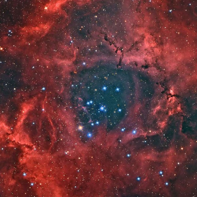 새로 형성된 별들과 가스구름이 함께 만든 이 성운은 직경이 130광년 정도 됩니다. 이온화된 수소가 스프레이로 뿌린 듯한 붉은색 깃털 구름 모양의 대부분을 구성하여 장미 성운의 독특한 색과 모양을 만듭니다.