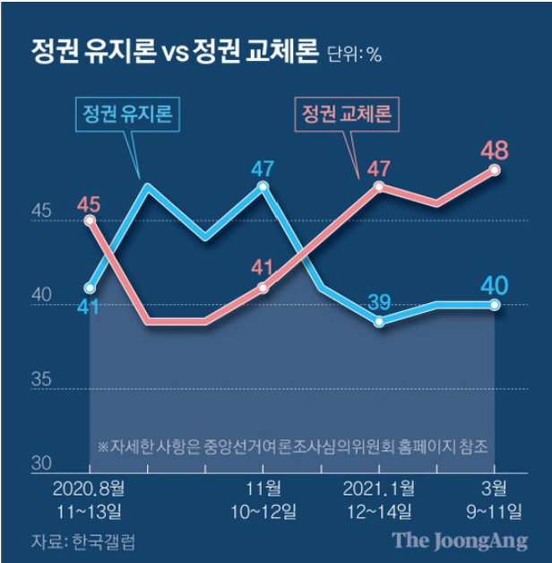 한국갤럽의 최근 여론조사(9~11일)에서 “내년 대선에서 정권 교체를 위해 야당 후보가 당선되는 것이 좋다”는 ‘정권 교체론’은 48%, “정권 유지를 위해 여당 후보가 당선되는 것이 좋다“는 ‘정권 유지론’은 40%였다. 정권 교체론은 지난해 10월만 해도 39%에 불과했지만, 지난 연말 추미애·윤석열 갈등 국면을 거치며 꾸준히 상승해 이번에 최고치(48%)로 나타났다.