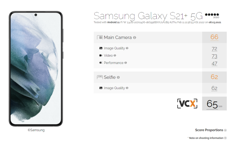 삼성 갤럭시 S21+ 카메라 성능입니다. 메인 것과 앞에 있는 셀프용의 성능이 65점이네요.
