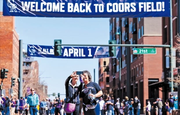 < 美 야구도 “웰컴 백” > 미국 콜로라도주 덴버의 쿠어스필드에서 1일(현지시간) 열린 ‘콜로라도 로키스 vs LA 다저스’의 2021 메이저리그 개막전에 앞서 팬들이 기념사진을 찍고 있다. 최근 미국에서는 코로나19 백신 접종이 속도를 내면서 경기 회복에 대한 기대가 커지고 있다. /USA투데이연합뉴스