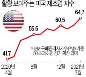지난 12개월간의 미 공급관리협회(ISM) 제조업지수 평균은 55.3이다. 지난달 기록한 64.7은 2월(60.8)보다 높은 것은 물론 평균치와 비교하면 9.4포인트나 차이 난다. 공장 주문(3.2포인트)과 생산(4.9포인트), 고용(5.2포인트) 등이 전달 대비 한꺼번에 늘었다. 월스트리트저널(WSJ)은 “식당에서 화학회사에 이르기까지 모든 주요 산업에서 수요가 증가하고 있다”며 “일제히 구매에 나서는 소비자들이 경기 확장을 주도하고 있다”고 분석했다.