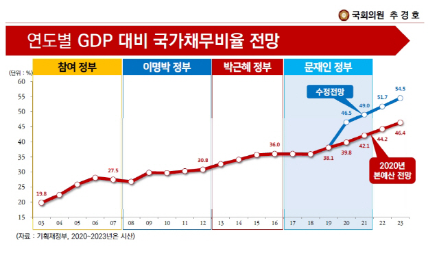 문재인 정부의 확장적 재정정책 기조로 인해 2026년 우리나라의 국내총생산(GDP) 대비 국가채무비율이 70% 수준으로 치솟을 것으로 전망됐다. 지난해 대비 국가채무비율이 20%P(포인트) 이상 급등할 것이라는 전망이다.