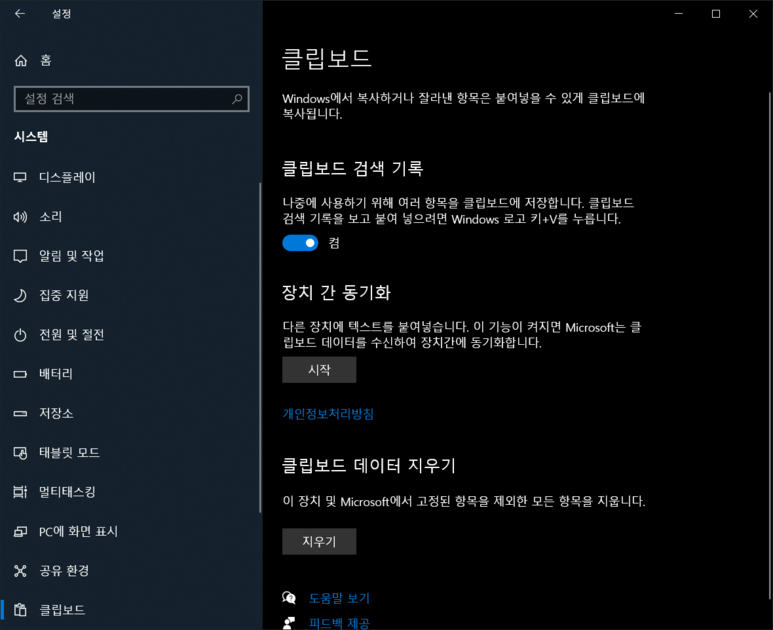 여기서 "시스템"을 클릭하면 왼쪽 아래쪽에 "클립보드"가 보일 겁니다. 이미지는 붙여 놓지 않을게요.