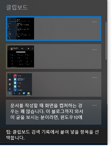 그렇게 했을 때 나오는 화면이네요. 과거 복사해 두었던 것들이 목록으로 보입니다. 여기서 필요한 것을 찾아 클릭하면 되겠죠?