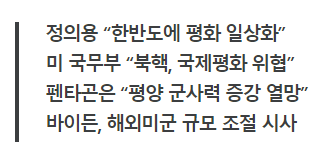 "정의용 외교부 장관 후보자가 지난 5일 국회 인사청문회에서 북한이 비핵화 의지를 갖고 있다고 평가한 데 대해 미국의 조 바이든 행정부가 “평양은 군사력 증강에 대한 열망을 갖고 있다”고 밝혔다." 출처 : 중앙일보