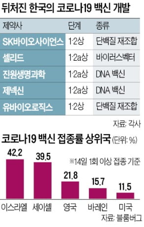 반면 임상 3상을 마치거나 3상 단계에서 국가별 사용 승인을 받은 제품은 세계적으로 10개에 이른다. 미국 영국은 물론 러시아 중국 인도가 각각 자국에서 개발된 백신을 사용 승인했다. 윤영호 서울대 의대 교수는 “코로나19 바이러스의 변이가 생기는 데다 새로운 감염병이 언제든 유행할 수 있기 때문에 감염병을 극복할 수 있는 백신 플랫폼을 구축하는 게 중요하다”고 했다.