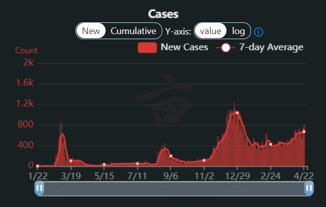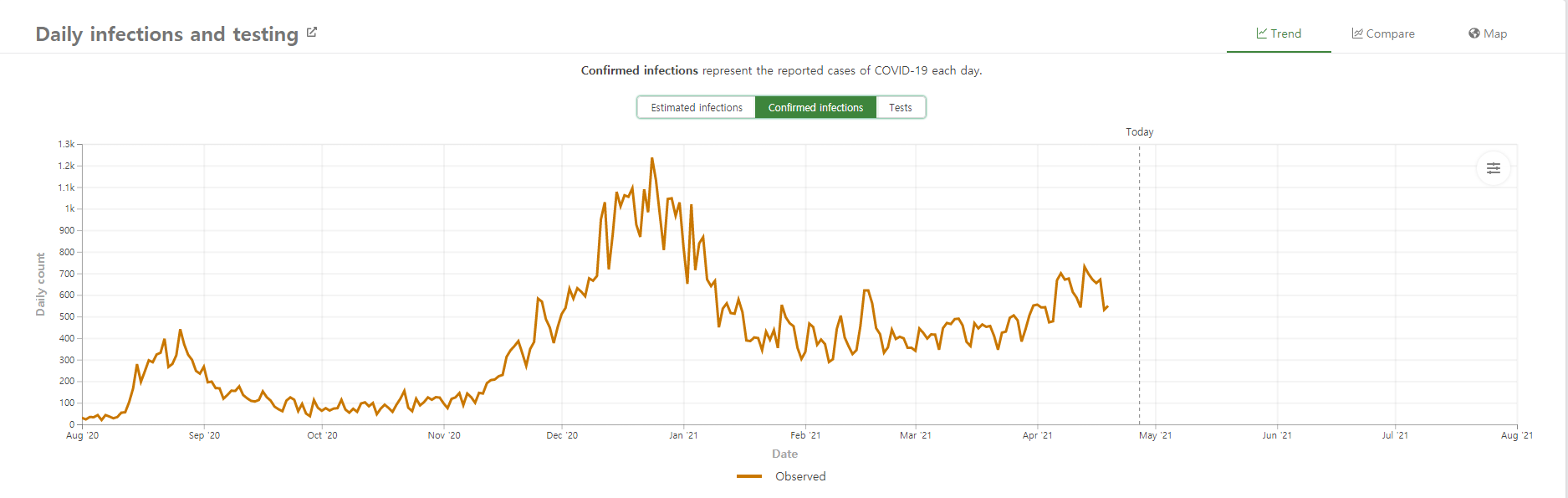 현재 대한민국의 코로나는 위 도표와 같다. 3차 위기가 오고 확진자 수는 내려갔지만 가장 낮을 때가 300명대이고 보통은 400, 500 그리고 지금은 600, 700명대다. 사실 전에 비하면 매우 위험한 상태입니다.