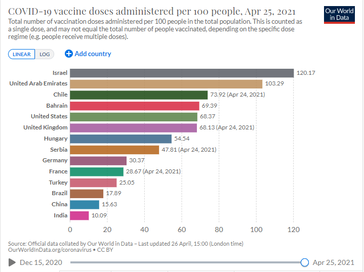다른 나라들은 백신에 집중해서 이미 단체 면역 이야기가 나오고 있는 상황이지요. 아래 그래프는 전 세계 백신 접종 순위입니다.