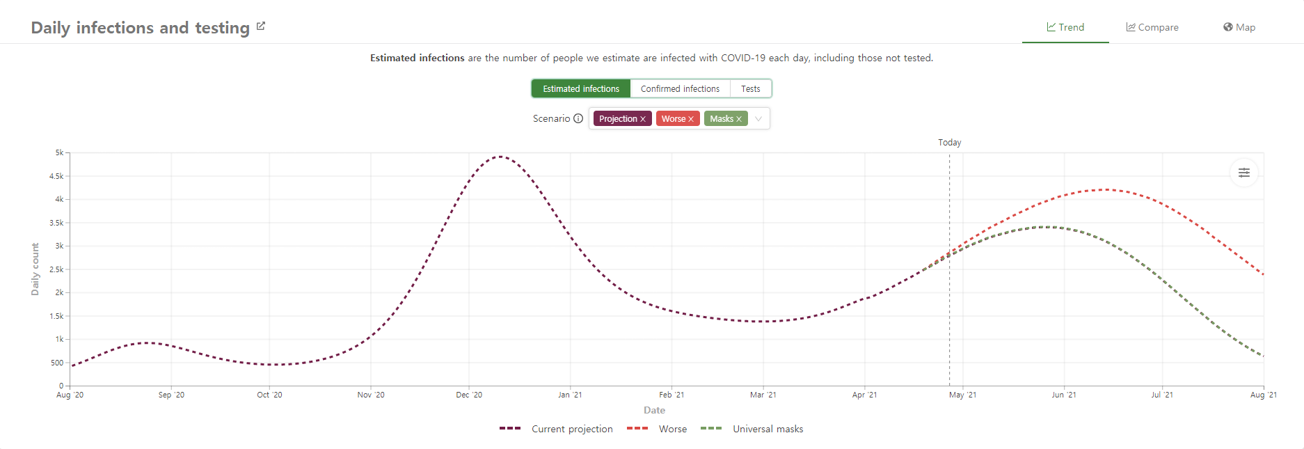 현재 코로나 상황으로 미래를 예측하는 그래프가 있는데, 먼저 확진자 그래프는 아래와 같습니다.
