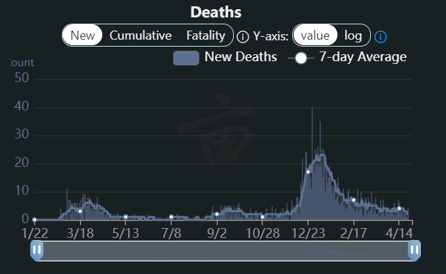 그런데, 확진자는 3차 이후 4차 위기가 올 것 같은 그래프를 보이고 있습니다. 매일 두터운 층 약 700명대의 확인자가 나오고 있습니다. 위험하지요. 우리나라 인구를 5천만이라고 하면 0.0014퍼센트가 매일 걸리고 있는 상황입니다. 다행인 것은 사망자가 그렇게 높지 않습니다.